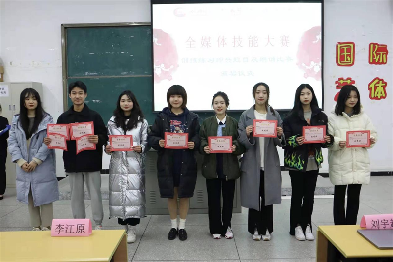 1月6日下午三点,我院首届全媒体技能大赛颁奖仪式于二教A座101教室举办。学院负责人、各教研室教师,获奖学生参加了本次仪式,21级播音与主持艺术专业谭鑫玥和汪媛媛两位同学担任主持。