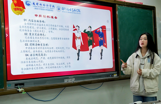 会议伊始,全体成员起立奏唱《光荣啊,中国共青团》。随后,国际传媒艺术学院组织部负责人杨舒淋同学对红旗团支部申报材料的注意事项进行了详细讲解。学院团委副书记杨柠霞提到,申报五四红旗团支部是团支部建设的重要目标之一,也是激励团支部积极进取的重要方式,制作申报材料需做到内容真实准确、突出特色亮点、材料规范完整、注重总结反思等四个方面。会议还规划部署了新学期政治理论学习任务清单与主题团日活动等内容。