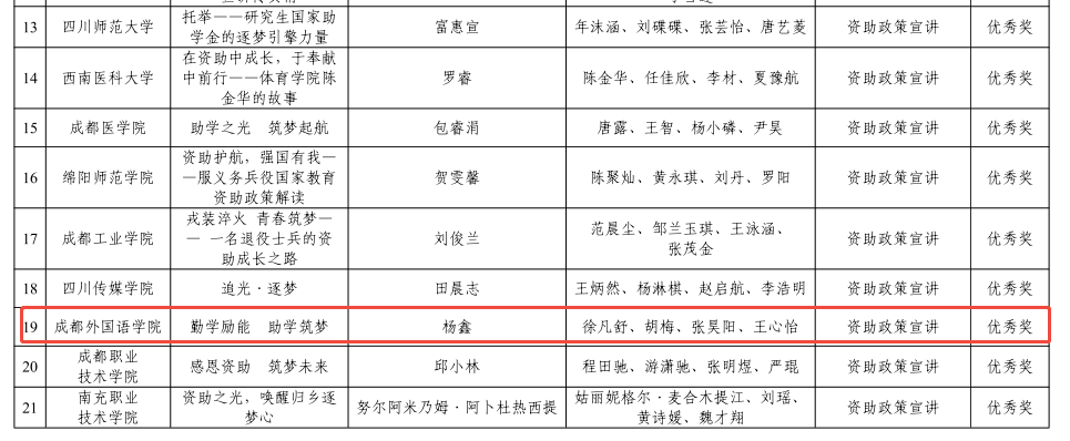 近日,四川省教育厅公布第四届 “感恩资助心向党 政策宣传我来讲” 微视频征集展播活动获奖名单,我院 2023 级国际新闻与传播专业学生杨鑫、徐凡舒、胡梅、张昊阳联合创作的微视频《勤学励能 助学筑梦》,在资助政策宣讲组别中成功斩获优秀奖。