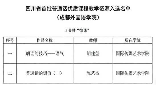 3月11日,四川省教师发展中心正式公布首批普通话优质课程教学资源遴选结果,我院胡建玺老师的《朗读的技巧——语气》、陈艺杰老师的《普通话的调值(一)》两门课程成功入选,充分彰显了学院在普通话教学与语言艺术教育领域的扎实功底与创新实践。